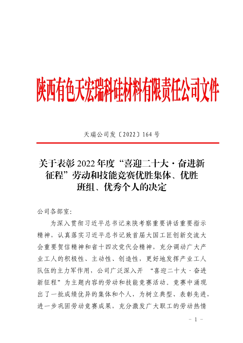 关于表彰“喜迎二十大·奋进新征程”劳动和技能竞赛优胜集体、优胜班组、优秀个人的决定